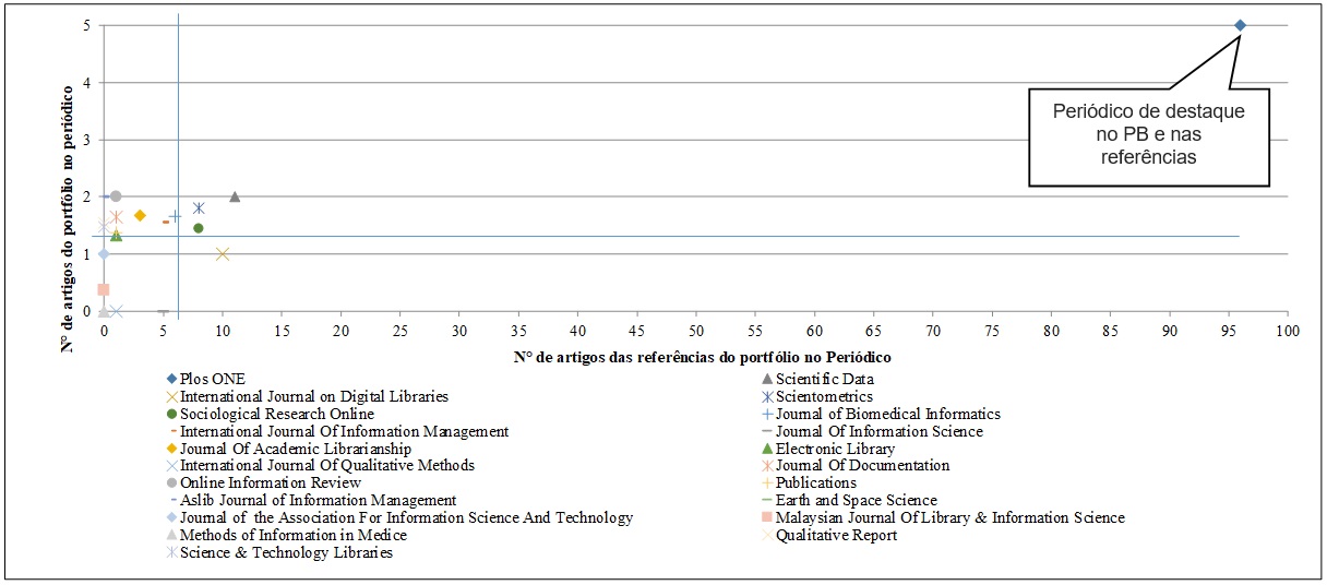 Ao se realizar uma comparação entre o número de artigos publicados no portfólio e o número de artigos citados nas referências, o PLOS ONE foi o mais representativo, pois obteve destaque tanto nas referências concentrando a publicação de 96 artigos quanto portfólio concentrando a publicação em artigos dos 32 selecionados, conforme Figura 10.