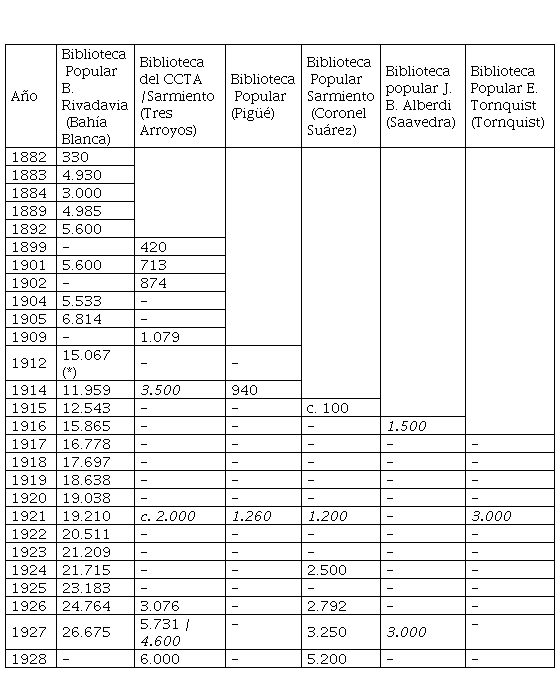 En el caso de la Asociación Bernardino Rivadavia (ABR), han podido consultarse los cinco primeros catálogos editados entre 1884 y 1916, la correspondencia recibida y emitida desde su fundación, las memorias redactadas entre 1912 y 1918, y los libros de actas desde 1882. En la Biblioteca del Centro de Comercio de Tres Arroyos (CCTA) (luego denominada Popular y, por último, Sarmiento), por su parte, se encuentran disponibles las actas desde su creación en 1899 y los copiadores de cartas a partir de 1910. Por último, en la Ernesto Tornquist (BET) (1917) de la localidad homónima y en la Alberdi (BAS) (1916) de Saavedra se han atesorado los primeros libros de actas, mientras que en la Popular (BPP) (1914) de Pigüé y en la Sarmiento (BSCS) (1915) de Coronel Suárez la documentación de la época fundacional ha desaparecido de sus sedes por diversos motivos, conservándose únicamente un catálogo de la primera y el estatuto original de la segunda en el archivo de la Comisión Nacional de Bibliotecas Populares (CONABIP). Estos vacíos fontanales se suplieron de manera parcial con los impresos periodísticos contemporáneos, donde solían aparecer notas dando cuenta de las donaciones recibidas por las bibliotecas, así como noticias referidas a su accionar. Esta información interna fue completada y confrontada, en la medida de lo posible, con los informes oficiales publicados en los anuarios bonaerenses, los censos y las memorias de las comisiones de fomento nacional y provincial.