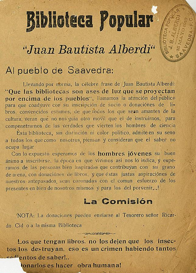 La exhortación precedente que los dirigentes de la Biblioteca Popular “Juan Bautista Alberdi” de la localidad de Saavedra dirigieron a sus paisanos durante una de sus primeras campañas de incorporación de socios y de libros, pone de relieve el sentido que tuvieron las donaciones bibliográficas como muestras del compromiso activo de los individuos en la construcción de lo colectivo, además de como fuentes de distinción simbólica para los mismos oferentes. Esta lógica, que había primado en los fundamentos mismos del modelo de las bibliotecas populares impulsado desde los últimos treinta años del siglo XIX, continuaba operando como principio para garantizar su continuidad y su conservación a inicios de la centuria siguiente pero no resultaba suficiente para sostener el crecimiento coherente y continuo de las colecciones. Si la su conformación había dependido en gran medida de las contribuciones de los vecinos de las localidades de origen, su desarrollo posterior requirió del concurso de los poderes públicos que, a medida que transcurría el tiempo, extendían y consolidaban su presencia en el territorio.
