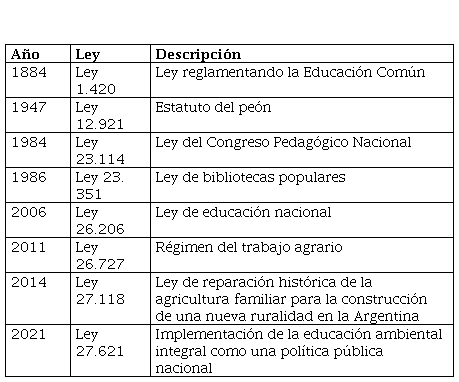 Uno de los últimos hechos en temas normativos, en el que consideramos se puede articular de manera efectiva en la educación el tema de lo ambiental se da con la Ley 27.621 de 2021 a través de la cual se dispone la implementación de la educación ambiental integral como una política pública nacional, esta deja ver la posibilidad de un efectivo trabajo entre dos Ministerios como el de Educación y el de Ambiente y Desarrollo Sostenible. En esta es evidente la necesidad del desarrollo de una conciencia ambiental, la pregunta por el lugar de nuestra especie en un sistema mayor y con ello las responsabilidades ciudadanas al rededor del patrimonio natural y cultural. Si bien no se refiere directamente a las ESyS y EP, encontramos en ella un ejercicio aplicado a la educación ambiental que puede ser útil como ruta para pensar cómo articular las economías campesinas con la cultura y la educación. A continuación, la Tabla 3, presenta una síntesis de las leyes vinculadas con la ruralidad, la educación y la cultura en la Argentina.