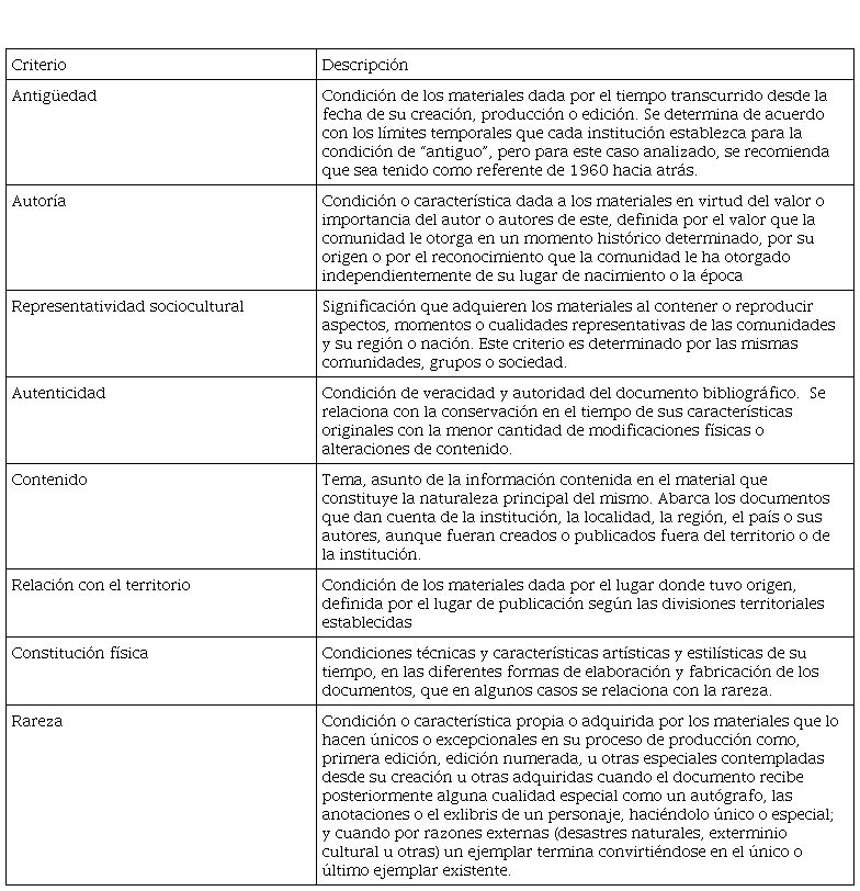 Fase 1. identificación de los materiales y/o colecciones en los municipios de la subregión y de sus custodios. Desde octubre de 2021 a marzo de 2022, se aplicó una encuesta a instituciones y personas que fueron rastreadas en los insumos ya mencionados, la cual estuvo acompañada de un conjunto de criterios surgidos de fuentes como la literatura propia sobre el área, la Política Pública para la Gestión del Patrimonio Bibliográfico y Documental y los resultados de las anteriores investigaciones y que se constituyeron en una guía y referente académico para valorar y caracterizar este tipo de patrimonio para el presente estudio (Tabla 1).