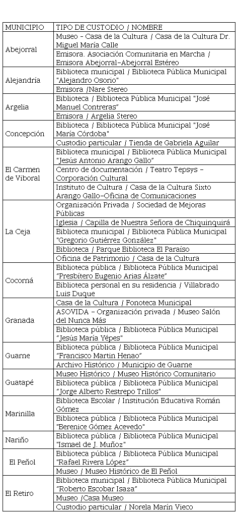 Desde marzo a octubre de 2022 se realizaron visitas a veintiún (21) municipios del Oriente Antioqueño (Tabla 2) con enfoque en los custodios o su representación (directivos, bibliotecarios, propietarios), a quienes se le realizaron entrevistas semiestructuradas y cuyos resultados fueron consignados en un documento de recolección de información de elaboración propia que permitió condensar interpretaciones, opiniones y percepciones por medio de la observación y el registro fotográfico.