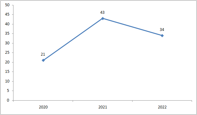 La Figura 7 compara la participación de mujeres como autoras o co-autoras en las publicaciones seleccionadas. En la muestra se observa un crecimiento constante respecto al año 2020 –en correspondencia con el primer año de pandemia-. Posteriormente, se incrementó en un 105% y 62% durante el año 2021 y 2022 respectivamente respecto al año 2020.