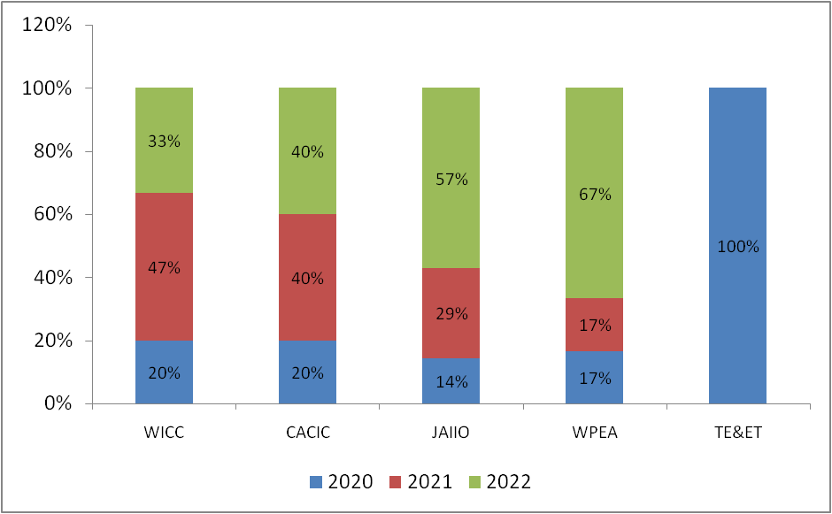 La Figura 2 muestra la cantidad de trabajos por año y por congreso, donde se observa un incremento en las presentaciones de los congresos JAIIO y WPEA. Podría decirse que el interés y el empeño puesto en la accesibilidad en JAIIO se incrementaron en un 100% y en WPEA, se acrecentaron las presentaciones estos dos años más del 100% entre el año 2021 y 2022.