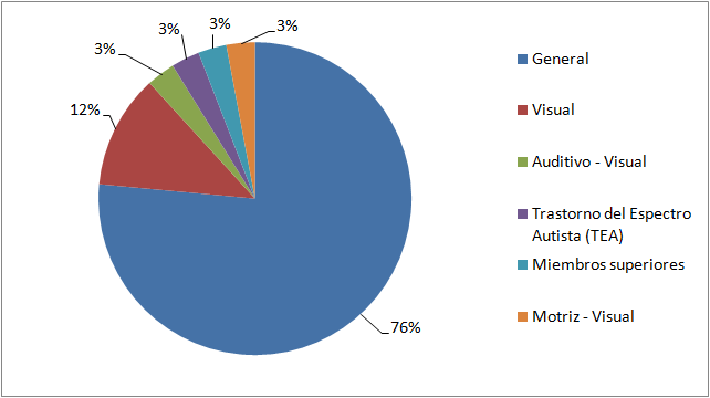 De la lectura de las presentaciones, se determinó que la mayoría abordó todo tipo de discapacidad. Lo expuesto se refleja en la Figura 3, donde los trabajos en su mayoría se basan en discapacidades generales (76%) y visuales (12%), y en menor medida los trabajos corresponden a otros tipos de discapacidades. Podría argumentarse que mayoritariamente se tratan las dificultades generales y visuales, siendo las frecuentemente abordadas en la literatura, además las herramientas las evalúan automáticamente.