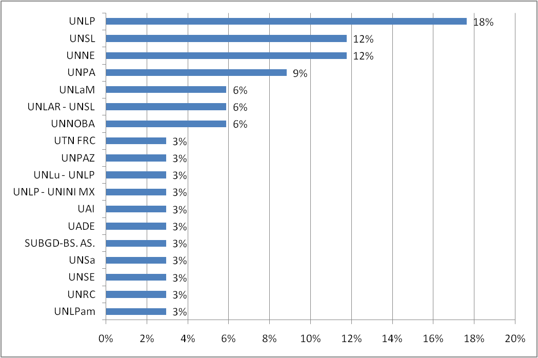 Del total de trabajos analizados (Figura 4), se detectó que en mayor medida las presentaciones pertenecen a grupos de investigación radicados en la Universidad Nacional de la Plata (UNLP), la Universidad Nacional de San Luis (UNSL) y la Universidad Nacional del Nordeste (UNNE). Por ello, es ineludible pensar que son potenciales investigadores de temas relacionados con la AW. Además, se determinó que existen universidades que publican conjuntamente, entre las que se pueden mencionar a la Universidad Nacional de La Rioja (UNLAR) y la UNSL; la UNLP y la Universidad Internacional Ibero-Americana (UNINI MX); y la Universidad Nacional de Luján (UNLu) y la UNLP.