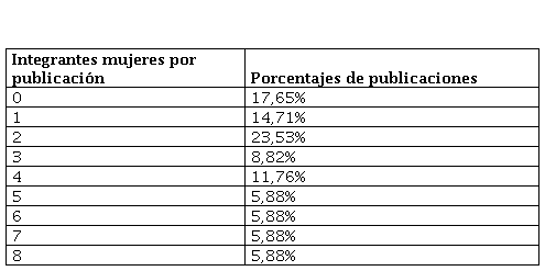 El número de mujeres participantes en los artículos seleccionados se detalla en la Tabla 1. Se observa que el 17,65% de las publicaciones carecen de integrantes mujeres, la participación de una mujer como autora o co-autora representa el 14,71% de la muestra, en el 23,53% de las publicaciones solo participaron dos mujeres, en el 8,82% se observa la presencia de tres mujeres, y el 11,76% se corresponde con artículos que denotan cuatro mujeres entre sus autoras. Asimismo, se observa que en el 5,88% de las publicaciones la cantidad de integrantes mujeres fueron entre cinco y ocho.
