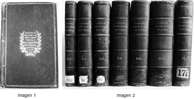 En primer lugar, el análisis de la primera variable es una particularidad resultante de la sustitución de la cubierta de los originales, dando como resultado nuevos volúmenes en sí mismos. En el caso de la enciclopedia Cahiers d'une élève de Saint-Denis, cours d'étudesseis (1855-1859),11 en tanto ejemplares facticios, se fueron encuadernando de dos en dos los volúmenes, excepto el volumen 13, compuesto en solitario. Esta modificación material introdujo otra propiedad: la indicación de quienes fueron sus propietarios. Por un lado, en el superlibris principal se leen los nombres de Procesa y Benjamín y, por otro, aparecen en los lomos, grabado en francés, el nombre de Shopie Lenoir. Esta última variable constituye un segundo superlibris, secundario, que representa indudablemente la propiedad de Sofía, quien donó los libros a la biblioteca estatal (ver Figura 1). Particularmente, esta segunda variante resultó un poco más compleja que otras al otorgarle la categoría de superlibris, por lo que adoptamos el criterio propuesto por Cataldo de Azevedo (2020) y Harispe, Hernández & Medina (2022).
