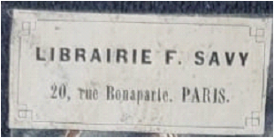 A partir de aquí, se desprende el examen sobre la variable etiqueta del librero, en este caso, la Libraire F. Savy - 20, rue Bonaparte (Paris) (ver Figura 2). Dicha etiqueta establece dónde se adquirieron o distribuyeron en Europa, al menos los 13 tomos de Cahiers d'une élève de Saint-Denis, cours d'étudesseis (1855-1859 por Paulin et Le Chevalier, Le Chevalier y Éditeurs, Armand Le Chevalier).