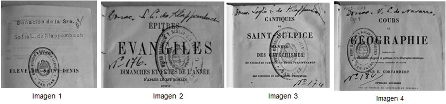 Prácticamente, fuera de la colección registrada en el Inventario general, todos los libros objeto de análisis (con superlibris principal), fueron donados por Sofía. En este caso, la colección Cahiers d'une élève de Saint-Denis (Nros. Inv. 9 al 15, consecutivamente), el Fables de Florian suivies des poèmes de Ruth et de Tobie [...] (Nº inv. 149), los Cantiques de Saint-Sulpice. Manuel des catéchismes de première communion et de persévérance [...], (2 ejemplares, nros. inv. 174 y 175), el Epitres et Evangiles des dimanches et fêtes de l'année [...] (Nº Inv. 176), el Cours théorique et practique de langue francaise [...] (Nro. Inv. 143), Grammaire du primere age. En cuanto al Traité pratique et raisonné de grammaire anglaise [...], aún sin ningun ex dono sabemos por los datos aportados desde el Inventario, que perteneció a la donación de Sofía (Nro. Inv. 38). El título restante, el Cours de geographie [...] (Inv. Nro. 184), fue el único libro obsequiado en nombre de Victorina.