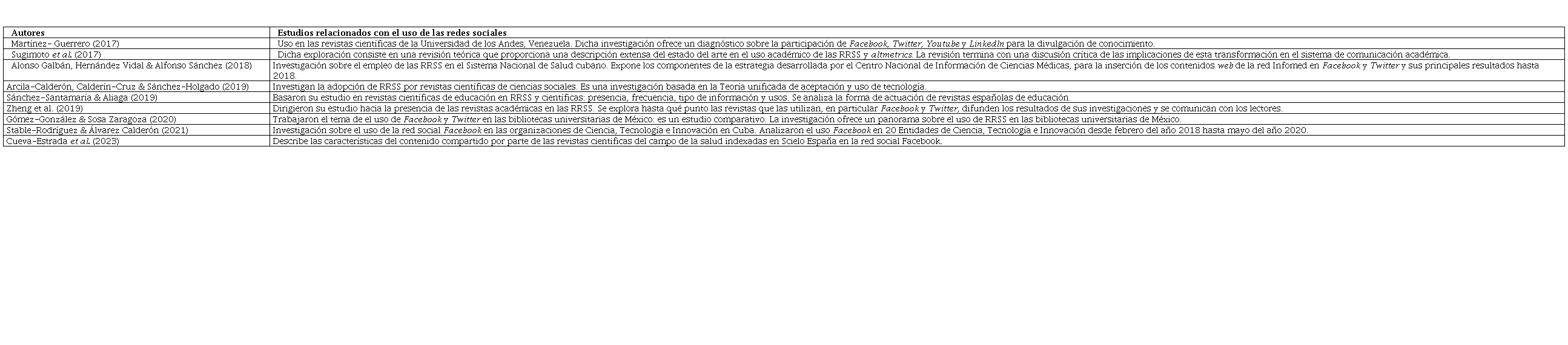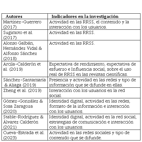 Sobre la base de la revisión de las fuentes consultadas se encuentran investigaciones que abordan el uso de las RRSS desde diferentes organizaciones o entidades que difunden información científica como: bibliotecas (Gómez-González & Sosa Zaragoza, 2020), sector de la salud en Cuba (Alonso Galbán, Hernández Vidal & Alfonso Sánchez, 2018), organizaciones de Ciencia, Tecnología e Innovación en Cuba (Stable-Rodríguez & Álvarez Calderón, 2021), desde las revistas científicas y académicas (Martínez-Guerrero, 2017; Arcila-Calderón et al., 2019; Sánchez-Santamaría & Aliaga, 2019 y Zheng et al., 2019 y Cueva-Estrada et al., 2023).