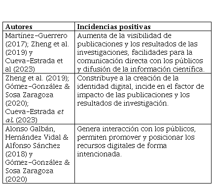 Se identifican estudios que resaltan el papel de las RRSS a partir de su incidencia positivas en su empleo para la difusion del conocimiento (Tabla 2).