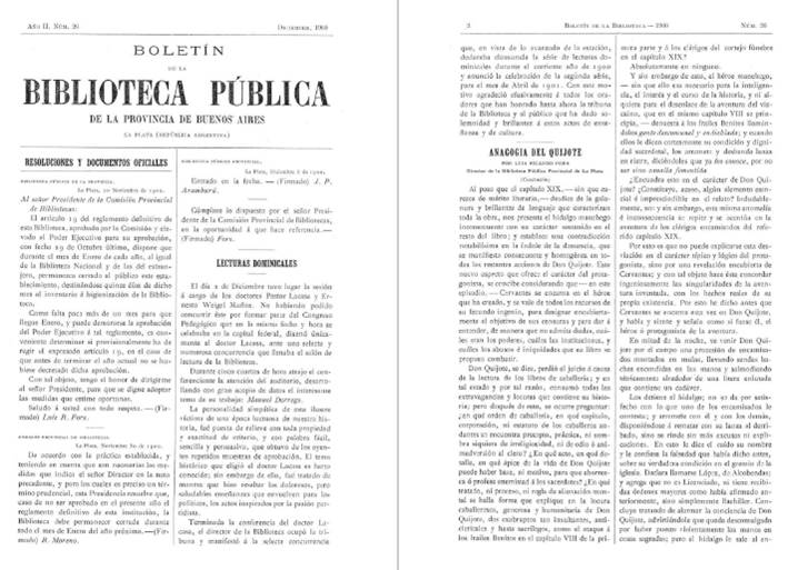 También los apartados para lectura fueron reflejo de los intereses personales e institucionales que orientaban la actividad de Fors. Agrupamos aquí una variedad de textos extensos (de hecho, publicados con frecuencia en más de un número y asociados por referencias de “continuará”, “continuación” o “véase”), de salida diferible y no estrictamente asociados a la vida pública y / o administrativa de la biblioteca. Un conjunto significativo de ellos trató diversos aspectos relativos a la vida y obra de Miguel de Cervantes Saavedra, algo que interesaba muy particularmente al director en su calidad de entusiasta cervantista, distinguido y reconocido por hispanistas de renombre del país e, incluso, por importantes críticos españoles (Fernández, 2005). A excepción de un breve soneto dedicado a Fors y transcripto en el Boletín, el resto de textos cervantinos incluidos correspondieron a la autoría de este último. Artículos críticos, extensos comentarios sobre descubrimientos editoriales, intercambios epistolares entre Fors y otros cervantistas e, incluso, obras del mismo Fors publicadas con anterioridad o posterioridad en otros medios, ocuparon gran cantidad de páginas del órgano bibliotecario. Junto a ellos, otros escritos sobre temas diversos completaban la variedad de lecturas: una mínima selección de las conferencias dominicales que tenían lugar en la biblioteca (luego de que su publicación en volumen aparte fuese discontinuada);6 notas relativas a la ciudad de La Plata y sus progresos; textos que informaban e historiaban sobre desarrollos en el ámbito de la cultura impresa; algún escrito referido a la historia nacional argentina y / o a sus personajes célebres; otros más dedicados a poner en “conocimiento de los trabajos literarios y bibliográficos de valía” (Fors en Boletín, 1904, número 72, p. 209).