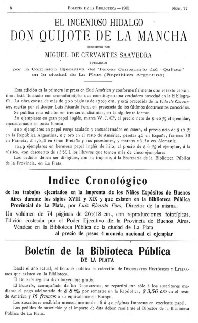 En paralelo, fragmentos del catálogo general se insertaron en los primeros números del Boletín en un intento de dar a conocer por este medio la integridad de las colecciones reunidas. Sin embargo, la iniciativa no prosperó, incluyéndose tan sólo un listado alfabético, en partes, de las obras que conformaban la primera sección del catálogo: Ciencias Naturales, Medicina é Higiene (Boletín, 1899, números 10-14). En los años siguientes sí se diseminaron desde este mismo espacio listados de colecciones particulares de la biblioteca: un índice alfabético de los diarios, revistas y demás publicaciones periódicas que se reciben en la Biblioteca Pública Provincial .Boletín, 1904, número 70; 1905, número 77); un Catálogo de las obras de Literatura cervantina que existen en la sección de Literatura del catálogo general sistemático de la Biblioteca Pública Provincial de La Plata .Boletín, 1903, número 60) y un anuncio permanente de cada uno de los materiales que mes a mes eran incorporados a la más amplia Colección Cervantina, en cuya conformación Fors trabajó con decidido empeño (Chicote, 2006); también el Inventario del Depósito Publicaciones, que funcionaba anexo a la biblioteca, junto a sus subsiguientes Adiciones a modo de actualización (Boletín, 1899, número 8; 1901, números 37, 38; 1902, números 40 y 45; 1903, números 51, 52, 60, 66, 67, 72; 1905, número 78) y, por último, un Inventario alfabético de los Duplicados y sus correspondientes Adiciones, materiales que —según el caso— se ofrecían en canje, venta y / o donación (Boletín, 1902, números 41, 42, 45, 49; 1903, números 51, 52, 61, 62, 64, 65, 66, 67; 1905, número 78). Además, desde el número 6 de 1899 y hasta el cierre del Boletín, se incluyeron listados de ejemplares que la biblioteca conservaba en su recinto y disponía a la venta: algunos de ellos correspondían a materiales editados por la misma institución, otros eran volúmenes producto de la actividad administrativa provincial y que ingresaban sistemáticamente al Depósito de Publicaciones, algunos más, títulos de los que simplemente existían innecesarios duplicados y de cuya venta se esperaba obtener algún rédito para la adquisición de obras faltantes.