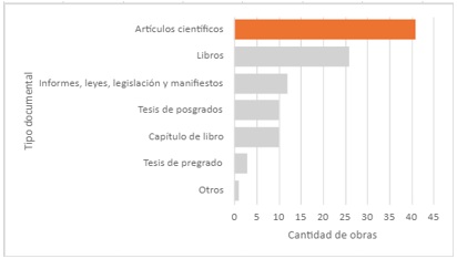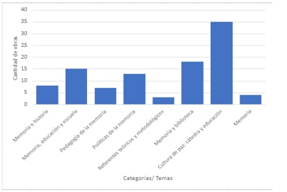 El centro de la documentación y fuentes objeto de la revisión y el análisis fueron principalmente artículos derivados de investigación, tesis de pregrado y posgrado, libros y capítulos de libro, manifiestos institucionales, y documentación legal e institucional. La memoria era el eje articulador de la propuesta, pero presentando múltiples relaciones con temáticas como: el conflicto armado, políticas de memoria, justicia transicional, historia de Colombia, memoria colectiva, memoria social, memoria y olvido, memoria y narrativa, acuerdo de paz, pedagogía de la memoria, cátedra de la escuela, instituciones de la memoria, educación para la paz y bibliotecas. Por el tipo de documento, los recursos abordados se consolidaron así: