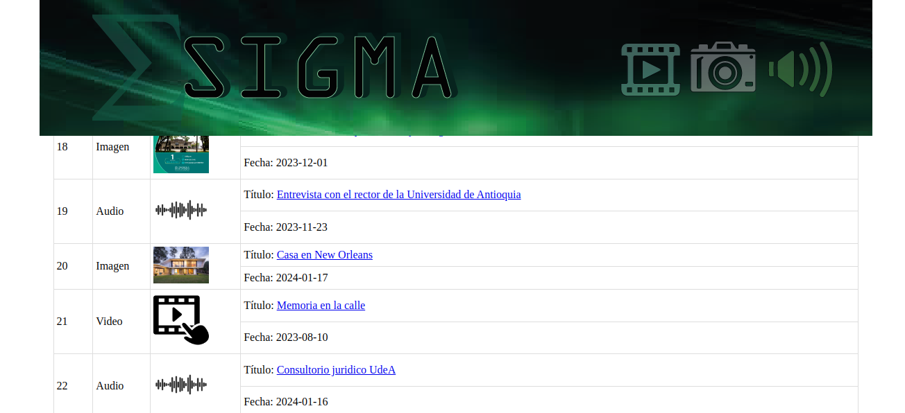 Al acceder a cada colección, se presenta un listado de los registros, mostrando el número de identificación del recurso, título, fecha y, si se ingresó archivo, una imagen en miniatura que lo representa. Este módulo también cuenta con un buscador que identifica coincidencias del parámetro dado en los campos título, descripción y fecha de todos los registros.