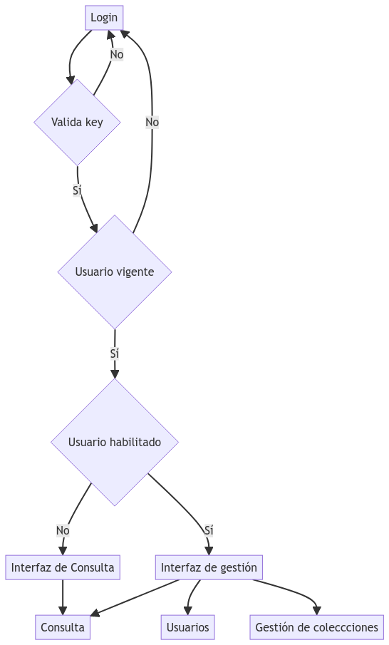 El flujo del sistema fue definido identificando dos interfaces: una de gestión y otra de consulta.