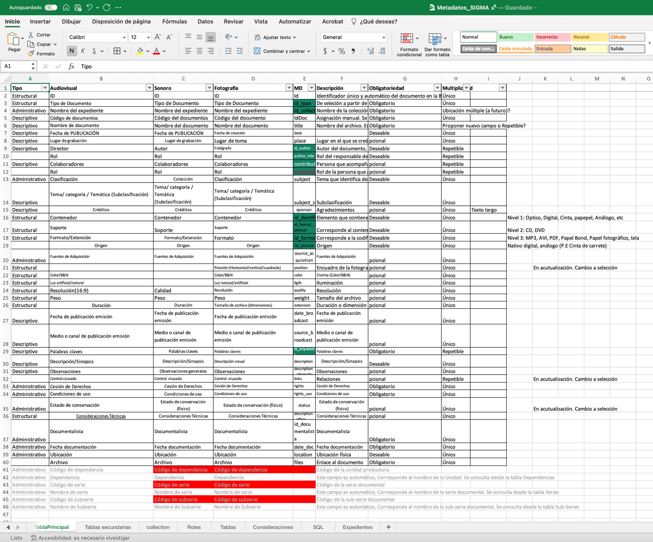Para conocer las entidades y sus atributos, fue necesario identificar los elementos que componen cada registro, por lo que en una hoja de cálculo se registraron las etiquetas correspondientes, descripción y características de obligatoriedad y multiplicidad (Figura 6).