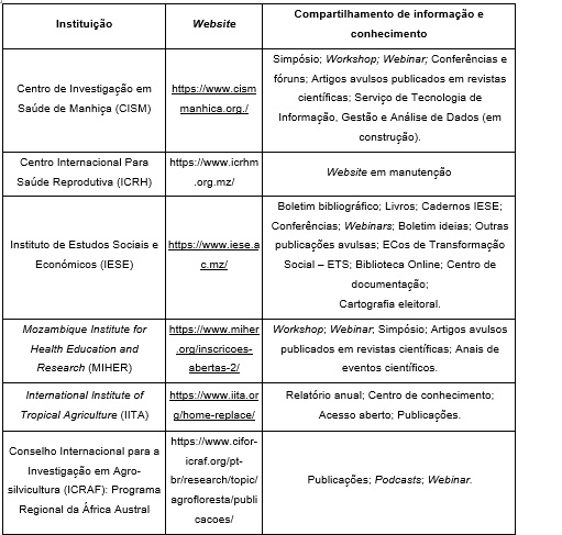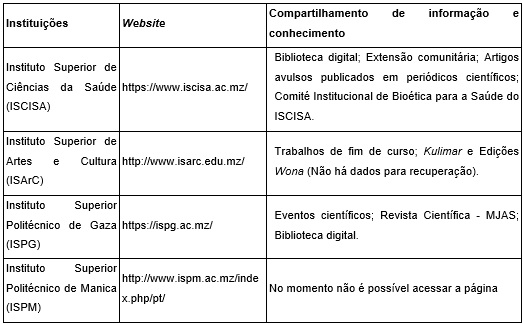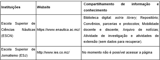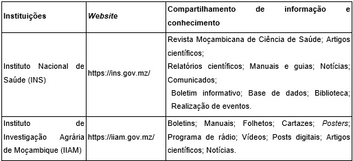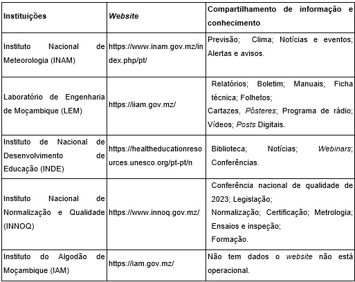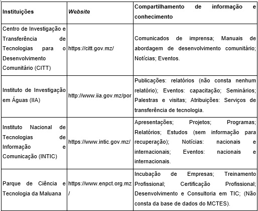 Quatro institutos compartilham conhecimento explícito em seus websites: Instituto de Investigação em Águas; Instituto Nacional de Tecnologias de Informação e Comunicação; Laboratório de Engenharia de Moçambique; Instituto Nacional de Normalização e Qualidade.