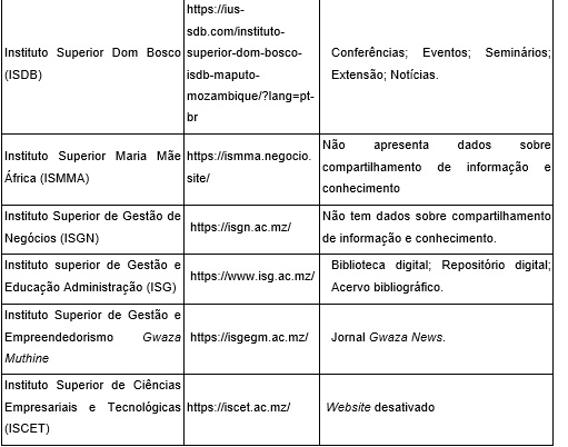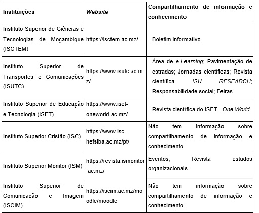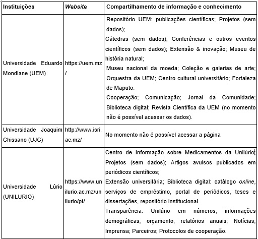 No quadro das Universidades públicas de Moçambique, descritas no Quadro 7, descrevem-se dados relacionados a designação da instituição, website e compartilhamento de informação e conhecimento. Foram contabilizadas 9 universidades públicas existentes em todo território de Moçambique. A complexidade da missão e visão das Universidades requer uma gestão descentralizada e projetada para o ensino, pesquisa, extensão e inovação radical e disruptiva, por isso, a universidade encarna o espírito do Sistema de CT&I discutido nesta pesquisa, e, visa fundamentalmente que colaborem conjuntamente como parte do sistema para garantir que o compartilhamento da informação e conhecimento possa gerar inovação e por consequência, o desenvolvimento das instituições e sociedade no geral. O conjunto das instituições comprometidas com o ensino, pesquisa, extensão universitária e inovação congregam universidades, escolas, academias e institutos superiores e politécnicos. Assim sendo, estas instituições devem trabalhar para que o compartilhamento de informação e conhecimento seja efetivo e célere de modo que as ações de compartilhamento possam ser aprimoradas e atuais.