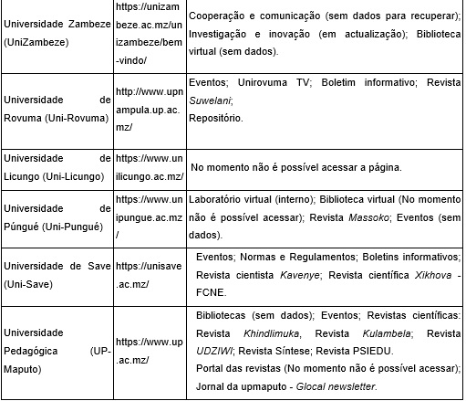 As instituições de pesquisa públicas que não possuem websites: Instituto Nacional de Hidrografia e Navegação, Centro Nacional de Biotecnologia e Biociências, Centro Nacional de Biotecnologia e Biociências, Instituto Nacional de Investigação Pesqueira, Instituto de Investigação Sócio-Cultural, Academia de Ciências de Moçambique.