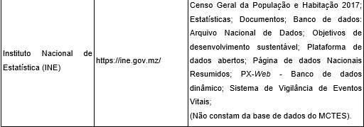 Ademais, importa referir que a verificação dos websites das instituições integrantes do sistema de CT&I, foi realizada nos links disponibilizados no Portal do Governo da República de Moçambique,1 e no website do Ministério da Ciência, Tecnologia e Ensino Superior de Moçambique,2 visto que as páginas das instituições arroladas como universo da pesquisa podem ser acessadas a partir destes websites centralizadores, bem como optou-se pela verificação no ambiente Google, nos casos em que o Portal do Governo, assim como o website do Ministério que tutela a área de CT&I não tivesse inserido a instituição e o link para seu website.