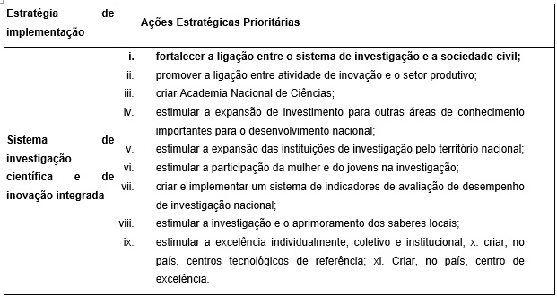 A PCTEI (2003) promove práticas de compartilhamento de informação e conhecimento nas instituições que compõem o sistema de CT&I de Moçambique, de modo que para alcançar os objetivos da política são definidos mecanismos de implantação. Ademais, a PCTEI define que, no âmbito do desenvolvimento de um sistema de disseminação e comunicação científica e tecnológica, para efeitos desta pesquisa, estabeleceu-se as seguintes ações estratégicas prioritárias: