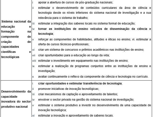 Sistema nacional da educação e formação na componente de criação de capacidades científicas e tecnológicas, com o seguinte indicador: tornar as instituições de ensino veículos de disseminação da ciência e tecnologia;