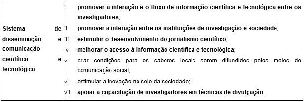 Sistema de disseminação e comunicação científica e tecnológica, com os seguintes indicadores: promover a interação e o fluxo de informação científica e tecnológica entre os investigadores; promover a interação entre as instituições de investigação e sociedade; estimular o desenvolvimento do jornalismo científico; melhorar o acesso à informação científica e tecnológica.