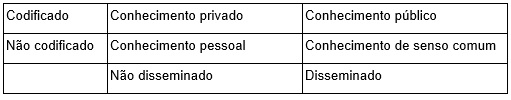 Uma organização possui três tipos de conhecimento: conhecimento tácito, contido na experiência de indivíduos e grupos; conhecimento explícito, codificado nas regras, rotinas e procedimentos da organização; e conhecimento cultural, expresso nas pressuposições, crenças e normas usadas pelos membros da organização para atribuir valor e significado a novos conhecimentos e informações (Choo, 2003, p. 365).