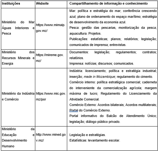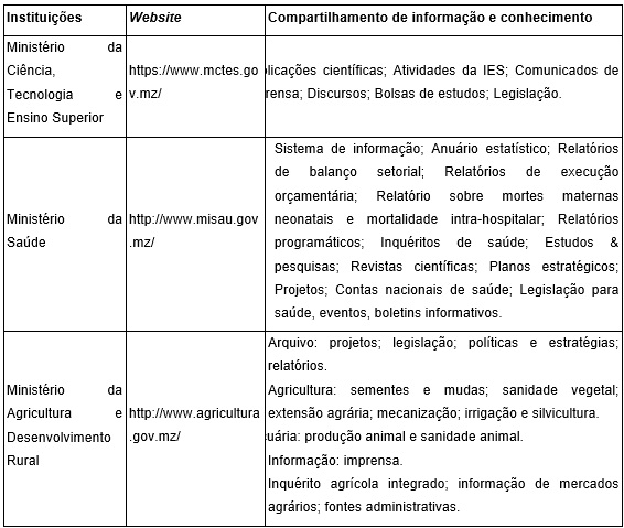 Sendo instituições governamentais, boa parte dos dados recolhidos nos websites dessas entidades correspondem ao compartilhamento de informações produzidas internamente, quais sejam: Ministério da Ciência, Tecnologia e Ensino Superior; Ministério da Saúde; Ministério da Agricultura e Desenvolvimento Rural; Ministério do Mar Águas Interiores e Pesca; Ministério dos Recursos Minerais e Energia; Ministério da Educação e Desenvolvimento Humano.