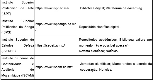 Os dados da pesquisa demonstram que 10 (dez) instituições mencionam em seus websites possuírem bibliotecas digitais: Instituto Superior de Ciências da Saúde; Instituto Superior Politécnico de Gaza; Instituto Superior de Tete; Instituto Superior de Estudos de Defesa; Escola Superior de Ciências Náuticas; Universidade Eduardo Mondlane; Universidade Lúrio; Universidade Zambeze; Universidade de Púngué; Universidade Pedagógica.