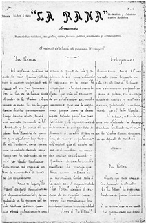 Estas publicaciones tienen sus orígenes en 1902 con el surgimiento de la edición anónima de La Risa (Figura 1); la cual que dejaba entrever entre sus líneas el dicho “Dios existe… pero atiende en Buenos Aires”. Este periódico, si bien se autodenominaba como un semanario dedicado a las noticias y a la literatura independiente, se permitía traslucir los malestares de la lejanía de la zona de ese entonces. Tuvo una sola edición, era manuscrito con un tamaño de 26 cm por 14 cm aproximadamente.