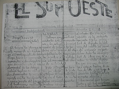 Si bien en Tierra del Fuego muchos procesos históricos, políticos y sociales, fueron distintos al resto de la Argentina por su condición insular, no estuvo ajena a las ideas anarcosindicalistas de la década del veinte. Así surgió Sur Oeste (Figura 7), un periódico anarquista que criticaba fuertemente al Gobernador de ese entonces, Manuel Fernández Valdés. Solo se editaron 4 ejemplares manuscritos y mimeografiados de una sola hoja.