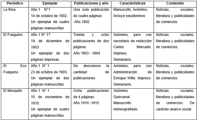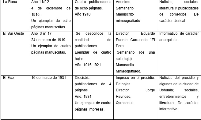 Dentro de la conceptualización que expresan los autores Jaramillo & Marín Agudelo (2014), los primeros periódicos de Tierra del Fuego se clasifican dentro de las características “externas” en espacio-territorialidad:5 porque fueron editados y publicados en Ushuaia, y otros dentro del presidio de esta misma ciudad, y son de especial importancia para el país por la experiencia innovadora de la época; además, estos documentos aportan información fundamental sobre el contexto de la época y de la localidad.