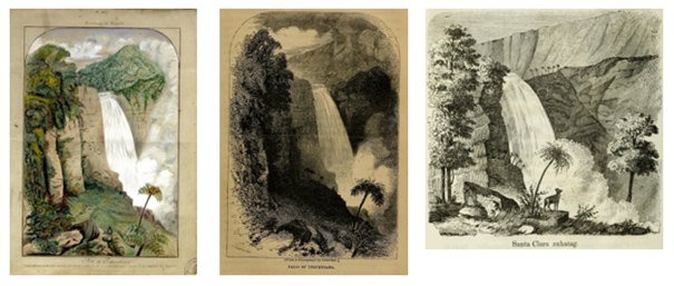 Puede decirse que Xántus operó de un modo similar con los demás grabados que copió del libro de Holton. Por ejemplo, cuando presenta las cataratas de Santa Clara, aprovecha el grabado del Salto de Tequendama para describir la portentosa caída de agua, pero no pierde oportunidad de incluir una experiencia real propia para otorgarle un carácter de anécdota. Para ello, la compara con las Cataratas del Niágara. En sus palabras,