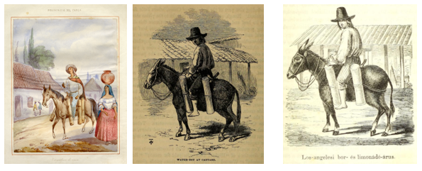 Volviendo a las descripciones de Xántus, es notorio el modo en el que el expedicionario húngaro construye convincentes relatos incluso sobre artefactos que desconoce. En su relato sobre los “vendedores de vino y limonada”, realiza una detallada exposición de las “flautas de caña” que se empleaban para el transporte de los líquidos, pero en realidad, en el motivo pictórico original, se trataba de un aguador que usaba flautas de un tipo de bambú endémico de la región neogranadina, la guadua (Figura 5). En el relato Xántus (1860, pp. 6-7) menciona “[…] los numerosos vendedores de vino y limonada que recorren las calles de un lado a otro. Cada uno de ellos va montado en un burro y lleva, a ambos lados, varias bolsas largas de cuero que cuelgan del sillín, llenas de vino o limonada. El vendedor sostiene en su regazo una pequeña caja repleta de cañitas de bambú.”