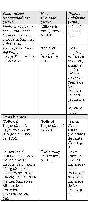 En Utazás Kalifornia el autor ofreció un segundo recuento de sus viajes por la parte sur de California, pero en él, además de volver a fabular sobre algunos sucesos, Xántus alcanzó un nuevo grado de tergiversación de la información. La publicación condensa 8 grabados y 8 litografías que ilustran llamativas escenas relativas a los parajes tropicales, agrestes vegetaciones, grandes valles, desiertos y montañas; además de retratar una singular población local indígena y precaria. A ello se suma un mapa plegable de toda la región, incluyendo por igual el territorio estadounidense y mexicano. Y aunque este artículo no busca centrarse en la descripción de las 17 ilustraciones del libro, lo que resulta llamativo es que particularmente 4 de los grabados estaban inspirados en aquellos que Holton incluyó en su publicación sobre la Nueva Granada. De manera más precisa, es menester recalcar que dos de ellos eran copias de la comentada serie litográfica Costumbres Neogranadinas de Ramón Torre Méndez, que vio la luz por primera vez en 1851. Los otros dos grabados que Xántus copia del libro de Holton también retratan paisajes o costumbres de la Nueva Granada, pero su origen es diverso. Para hacer más fácilmente el discernimiento de estos entrecruzamientos, el recuento de las estampas que coinciden en las tres publicaciones se ofrece a continuación (Tabla 1).