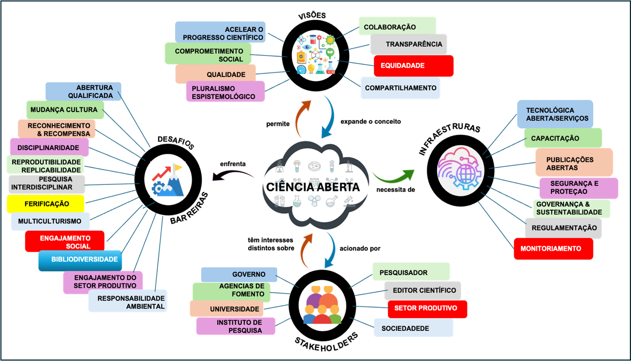 Ciência aberta não é um termo novo, mas seu envergamento contemporâneo incorpora novas visões e promessas ampliadas por diversos interesses científicos, políticos, estratégicos e sociais, que interpõem desafios e barreiras para a translação que todos almejam. Algumas barreiras às prática abertas podem ser endereçadas por meio do desenvolvimento de infraestruturas tecnológicas abertas, padronizadas e apropriadas às dinâmicas da ciência aberta, que poderíamos chamar de barreiras físicas, enquanto algumas outras só podem ser mitigadas por meio de mudanças bastante ponderadas em dimensões como institucionalização, políticas de reconhecimento e premiação, regulamentos, sustentabilidade econômica e práticas das partes interessadas nos empreendimentos de pesquisa, que poderíamos chamá-las de barreiras políticas e econômicas. Ainda há as barreiras culturais e cognitivas – barreiras mais subjetivas - provocadas por tradições disciplinares e comunitárias, visões distorcidas e pouco informadas sobre as práticas colaborativas e abertas, que para serem minimizadas exigem mudanças comportamentais e culturais. Precisa-se considerar ainda as barreiras éticas e legais, que estão interrelacionadas de forma complexa com outras esferas da ciência e da sociedade. Compreende-se que o rebaixamento de algumas barreiras tem um efeito mais contundente sobre o exercício da ciência aberta, do que outras, como por exemplo, a abertura de publicações, dados e códigos, porém a escala de abertura desses produtos de pesquisa depende também do equacionamento correto de todos os outros desafios que se entrelaçam e se sobrepõem. Essas barreiras tornam claro que é necessário um arcabouço organizacional, técnico, político e regulatório – ou seja, um padrão de governança - dedicado às práticas da ciência aberta, que assegurem uma infraestrutura confiável para a integridade, a persistência dos objetos de pesquisa (National Academy of Sciences, 2018) e para o aprimoramento das práticas colaborativas.