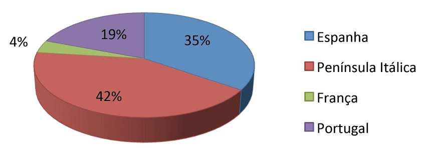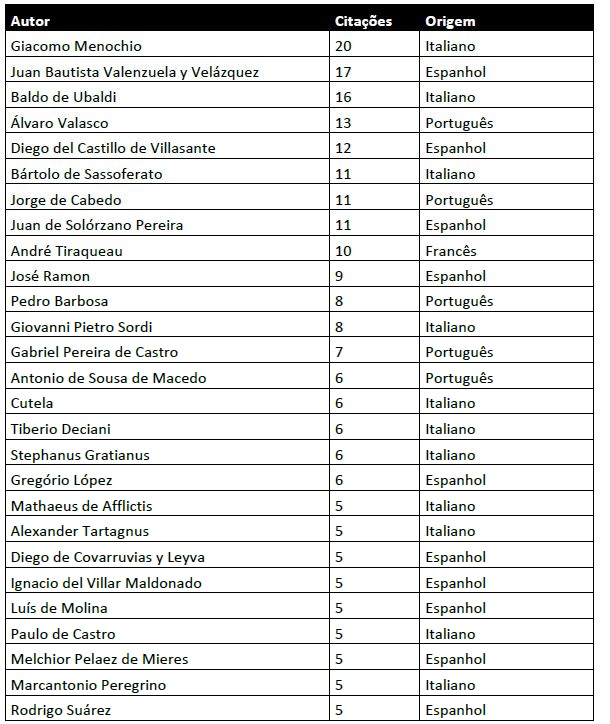 Percebe-se que, seguindo-se o que comumente acontecia na literatura jurídica do Antigo Regime, Pegas estava mais preocupado com a resolução do problema concreto que lhe foi posto do que em construir uma argumentação que considerasse unicamente o elemento nacional. Isso se percebe claramente no gráfico abaixo, em que se demonstra a presença maciça de autores estrangeiros, especialmente de italianos e espanhóis, constando apenas cinco portugueses entre os nomes que aparecem mais do que cinco vezes.