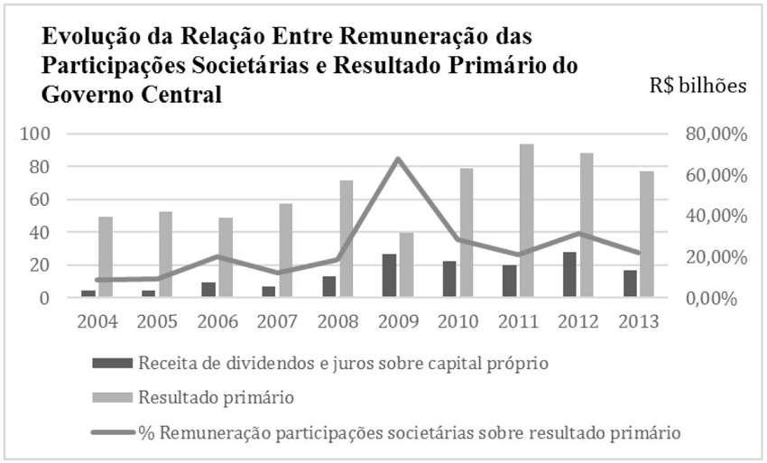 Dados do TCU, de 2013, relativos aos anos de 2004 a 2013 confirmam a importância das estatais para a poupança fiscal (TCU, 2013). O gráfico 1 indica como as estatais contribuíram de maneira expressiva para a formação de superávit primário no período anterior à crise fiscal de 2015.