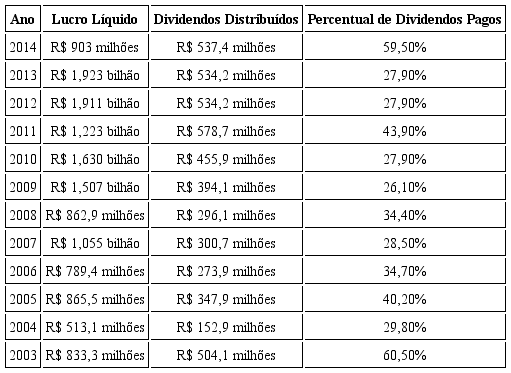 Nos últimos anos, verifica-se ainda um esforço de manutenção de um volume total de pagamentos de dividendos em um patamar superior ao dos 500 milhões de reais, mesmo em cenários de expressiva redução do lucro auferido, como é o caso do ano de 2014. Isto é, embora o estatuto estabeleça uma margem percentual para o pagamento de dividendos, a empresa parece ter mantido uma quantia financeira fixa de divisão de lucros, mesmo com a lucratividade declinando no último exercício.