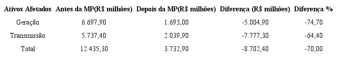 Levado a julgamento pelo colegiado, a posição da relatora prevaleceu e a CVM firmou pela primeira vez um precedente sobre abuso de poder de controle em sociedades de economia mista. 25 Na decisão, a CVM considerou que havia dúvida no segmento sobre a adequação da nova metodologia como parâmetro para a indenização dos ativos remanescentes ao final dos contratos de concessão. A Superintendência de Relação com Empresas (SEP) indicou em sua acusação contra a União que esta, como controladora “sempre aprovou em assembleia as demonstrações financeiras [da Companhia], nas quais a posição da administração [sobre como calculá-la] havia sido colocada expressamente” ( CVM, 2015 , p. 2). Além disso, a CVM reconheceu que as novas tarifas teriam um impacto significativo no valor dos ativos do grupo Eletrobrás, conforme indica a tabela abaixo. Com base nesses elementos, o colegiado da CVM decidiu condenar a União em maio de 2015 em penalidade pecuniária equivalente ao valor de 500 mil reais.