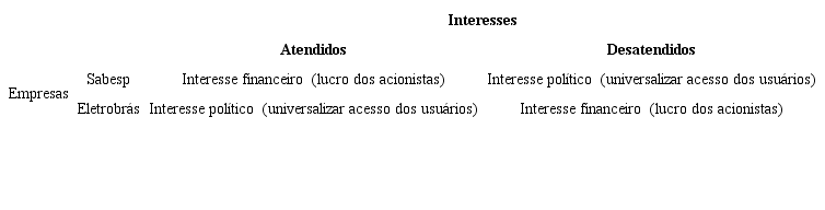 Os estudos de caso sugerem duas situações simétricas. No caso da Sabesp, o Estado parece ter-se alinhado com os interesses dos investidores privados. Com isso, garantiu um fluxo estável de pagamento de dividendos, mas penalizou os usuários do serviço público de saneamento. A consequência desta opção é o deslocamento do mandato público de universalização do acesso aos serviços sanitários, fato esse parametrizado pelo pleito de reequilibro econômico-financeiro e pelo reajuste sequencial das tarifas. Para isso, além dos alinhamentos societários entre o controlador (estado) e os minoritários (acionistas privados), houve ainda uma composição de interesses com a agência reguladora, em detrimento dos usuários do serviço, a quem se atribuiu o ônus da crise. No limite, supondo-se a relação entre estatização e privatização como uma régua contínua, o caso da Sabesp revela um deslocamento funcional da empresa para o lado da privatização, ainda que estruturalmente a empresa tenha se mantido controlada pelo estado.
