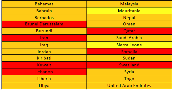 Para apresentar os países que possuem leis de nacionalidade discriminatórias de gênero, o relatório do ACNUR criou a tabela, a seguir exposta, onde se dividem os 26 países em três categorias conforme a lei de cada um: a) Vermelho: leis de nacionalidade que não permitem à mãe conferir sua nacionalidade a seus filhos, sem ou com limitadas exceções. Essas leis criam o grande risco de apatridia. b) Laranja: leis de nacionalidade com alguma precaução para evitar a apatridia, com exceções como permitir a nacionalidade da mãe nos casos em que o pai é desconhecido ou apátrida. c) Amarelo: leis de nacionalidade que limitam a conferência da nacionalidade pela mãe, mas adicionam garantias que assegurem a não ocorrência da apatridia (UNHCR, 2017, p.3).