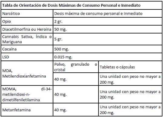 Em 2009 se acrescentou um novo capítulo a Lei Geral de Saúde, chamado “Delitos Contra la Salud en su modalidad de Narcomenudeo”, capítulo VII, em que se determina a implementação de um regime penal mais brando, segundo a estipulação de critérios objetivos ditados pela própria lei10. Desse modo, o art. 479 do referido diploma passou a determinar que seja presumida a finalidade de consumo pessoal caso a quantidade apreendida de narcótico não supere à prevista na “Tabela de Orientação de Doses Máximas de Consumo Pessoal e Imediato”, que reproduzimos a seguir: