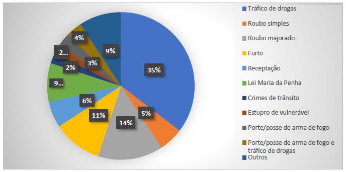 Como se observa, a grande frequência de crimes na custódia gira em torno dos crimes de tráfico de drogas (35%) e patrimoniais (roubos, receptação e furto totalizam 36%). Os crimes patrimoniais sem violência (furto e receptação) totalizam 17% dos casos. Esses dados não são surpreendentes, já tendo havido uma ampla exploração do caráter seletivo da atividade policial, que recai primordialmente sobre as ilegalidades populares42.