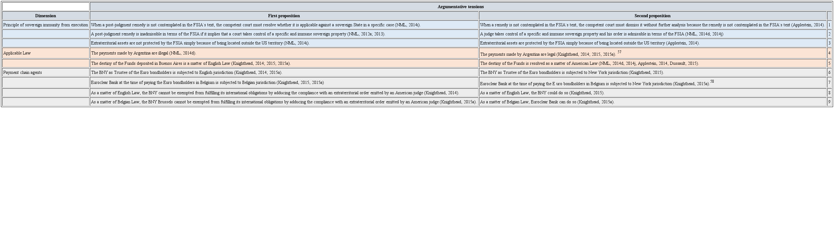 In this dispute, the majority of the intervening magistrates agreed that the property of these Funds did not belong any longer to Argentina (Knighthead, 2015; 2015a). However, they presented different positions concerning the scope of the «execution sovereign immunity principle», the «applicable Law» and the «responsibility of the custodians of these Funds». Then, a question arises: Which were the argumentative tensions in the resolutions of these magistrates related to these three dimensions?
