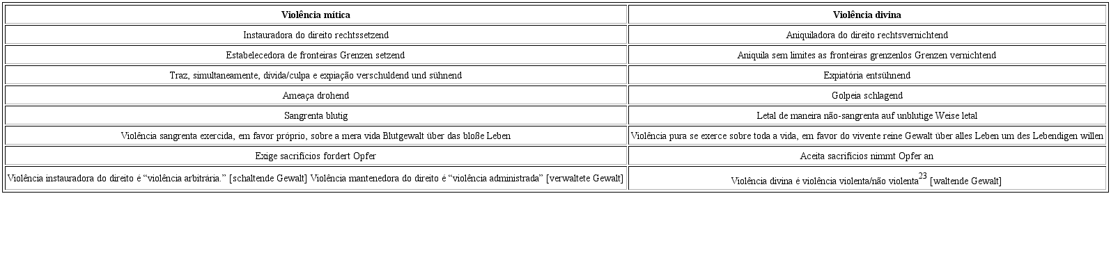 Contra o pano de fundo dos primeiros esboços e ensaios de Benjamin, entre 1916 e 1921, e à luz de sua posição sobre a virada ética do monoteísmo de Cohen, não surpreende que seu ensaio Para a crítica da violência empregue como sua distinção mais crucial os pares antitéticos pagão/mítico e monoteísta/divino. Se considerarmos a seguinte tabela, essa contraposição assimétrica torna-se aparente22.