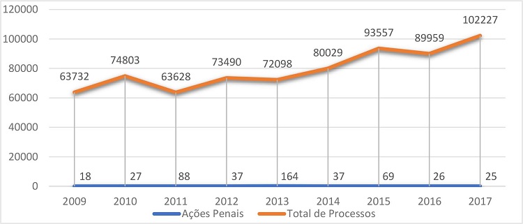 Conforme consta no Relatório Supremo em Ação dos anos de 2017 e 20181, a média do número de ações penais distribuídas entre os anos de 2009 a 2017 esteve um pouco acima das 50 ações penais por ano (CNJ, 2017, p. 43). No Gráfico 1 é possível ver o número de ações penais distribuídas por ano no STF, no período de 2009 a 2017, em comparação com o número total de processos distribuídos naquela Corte.